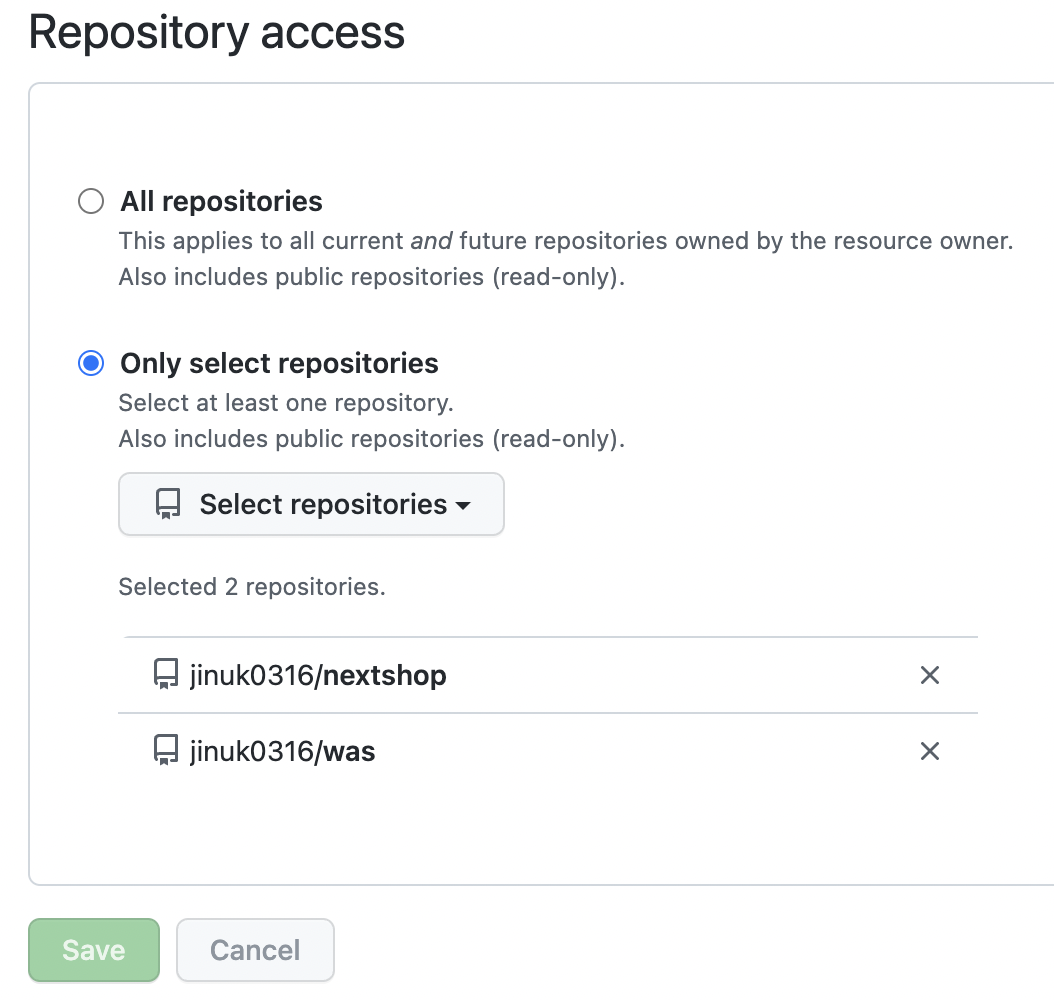 하단으로 내려보면 Select repositories버튼이 있는데 이 버튼을 클릭하셔서 아까 GitHub에 올린 프로젝트를 찾아서