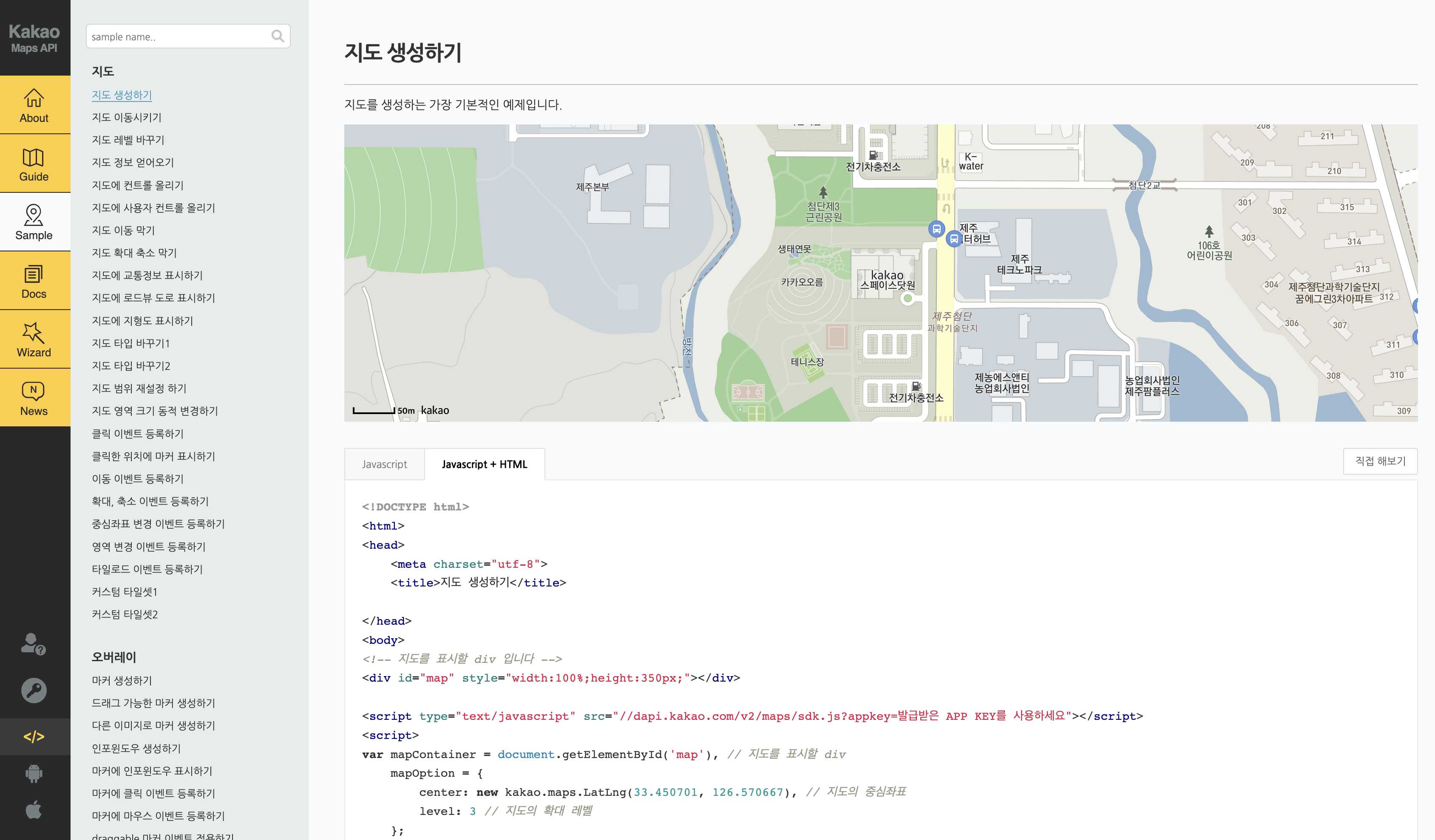 Sample에 지도 생성하기를 클릭하고 Javascript + HTML코드를 복사합니다.