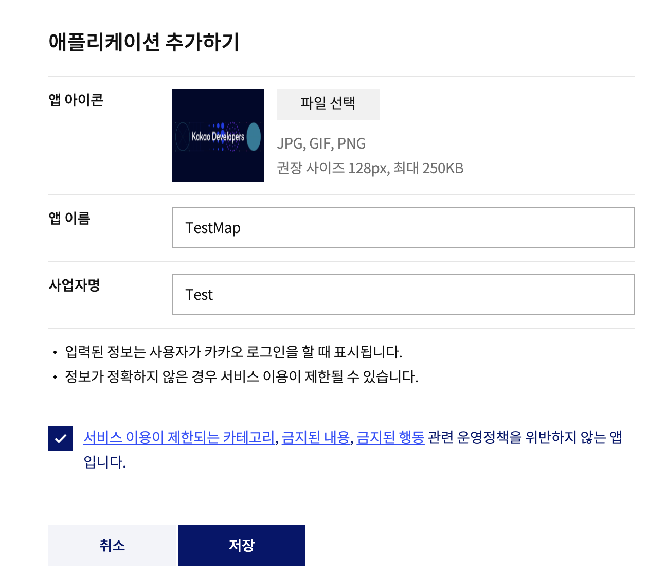 앱아이콘, 앱 이름, 사업자명을 넣고 하단 체크박스를 체크해 준 뒤에 저장버튼을 누릅니다.