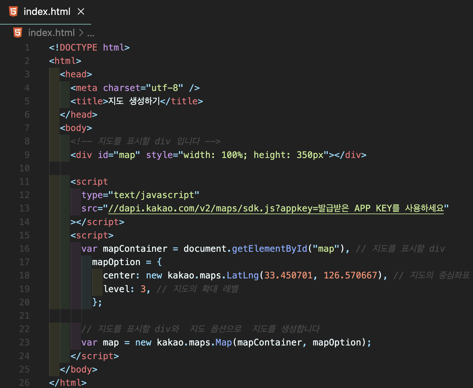 13번째 줄에 발급받은 APP KEY를 사용하세요 에 APP KEY(인증키)를 넣어야 하는데