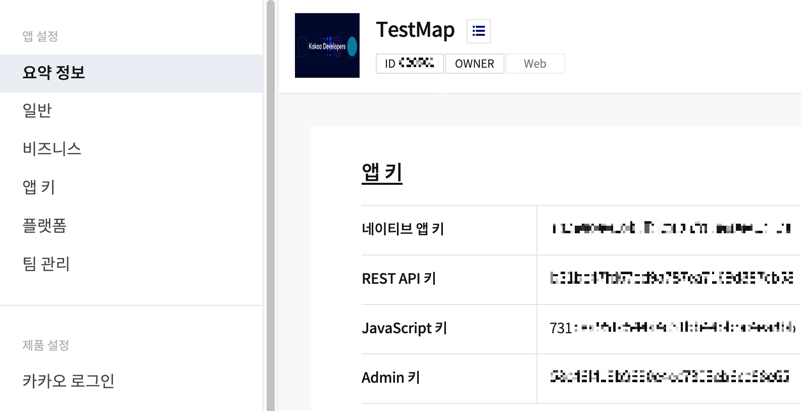 이 APP KEY(인증키)는 내 애플리케이션 > 앱설정 > 요약정보에 있다.