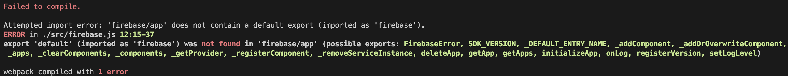 바로 firebase.js파일에서 다음과 같은 오류가 생깁니다.