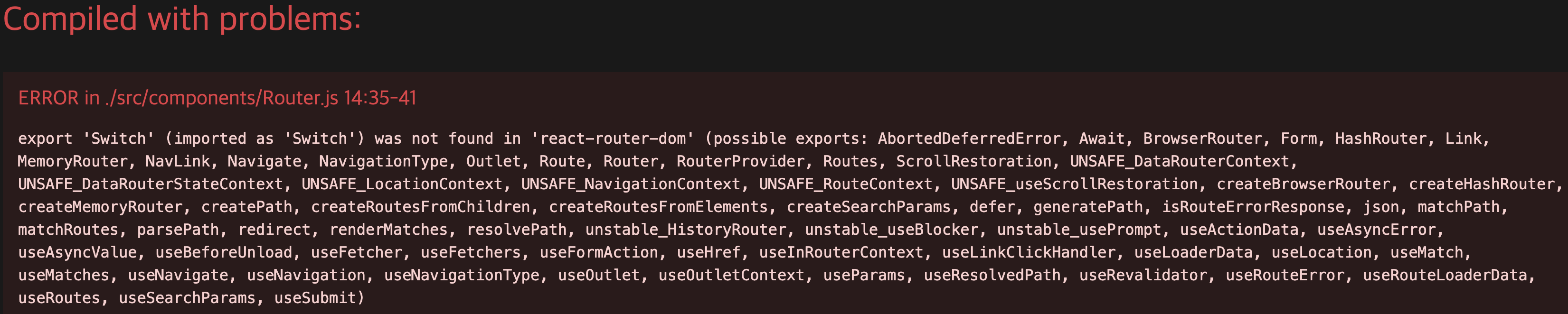 바로 export 'Switch' (imported as 'Switch') was not found in 'react-router-dom' 입니다.