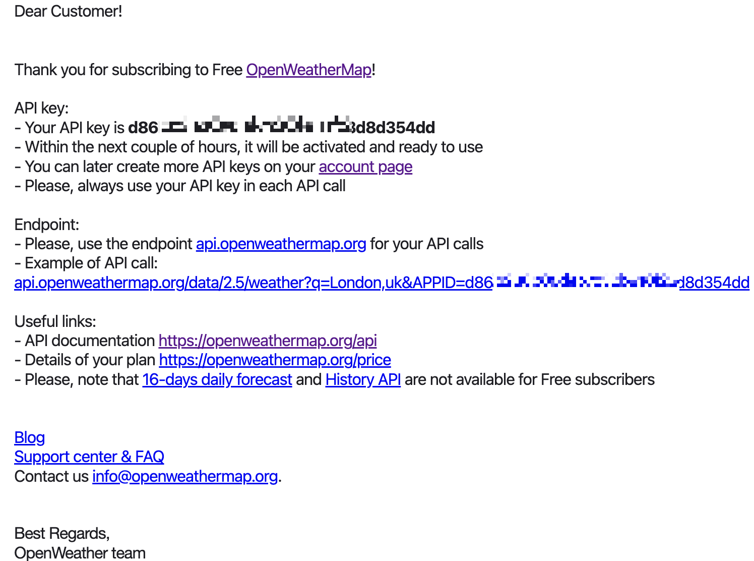 2. 두번째 메일을 보면 개인의 API Key를 주고 "앞으로 몇 시간 안에 활성화되어 사용할 준비가 될 것입니다."라고 알려줍니다.