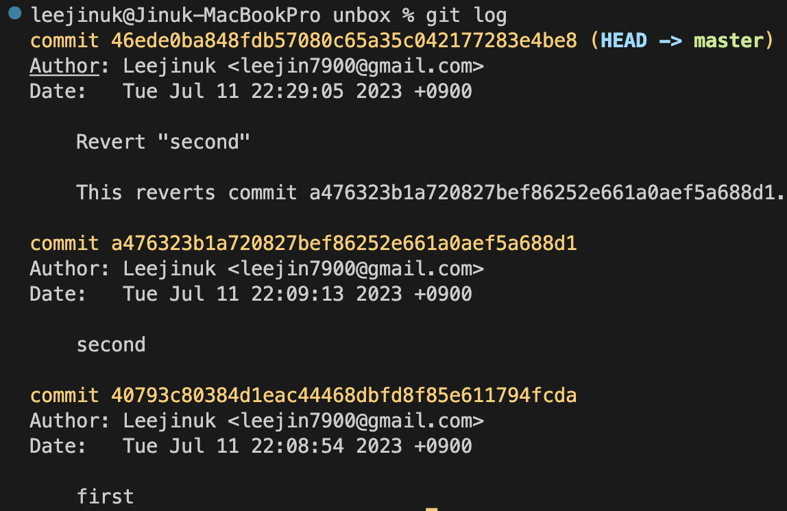 다시 git log 를 입력해보면, 아까 commit 했었던 기록들은 다 남아있고, Revert 한 것 또한 하나의 commit 으로서 남아있게 됩니다.