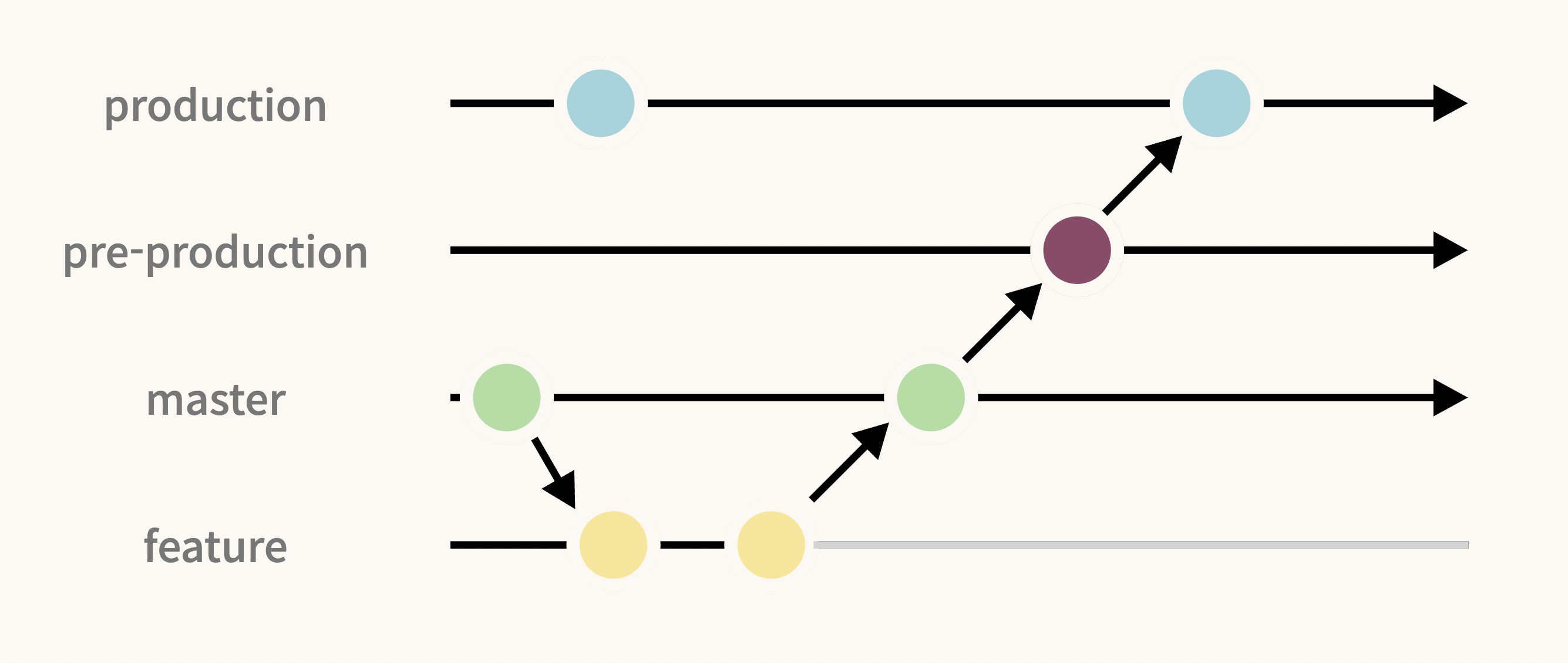 pre-production 브랜치가 테스트를 담당하고, master 브랜치가 개발용 브랜치로 역할합니다. feature 브랜치는 다른 flow 와 마찬가지로 merge 되면 삭제됩니다.