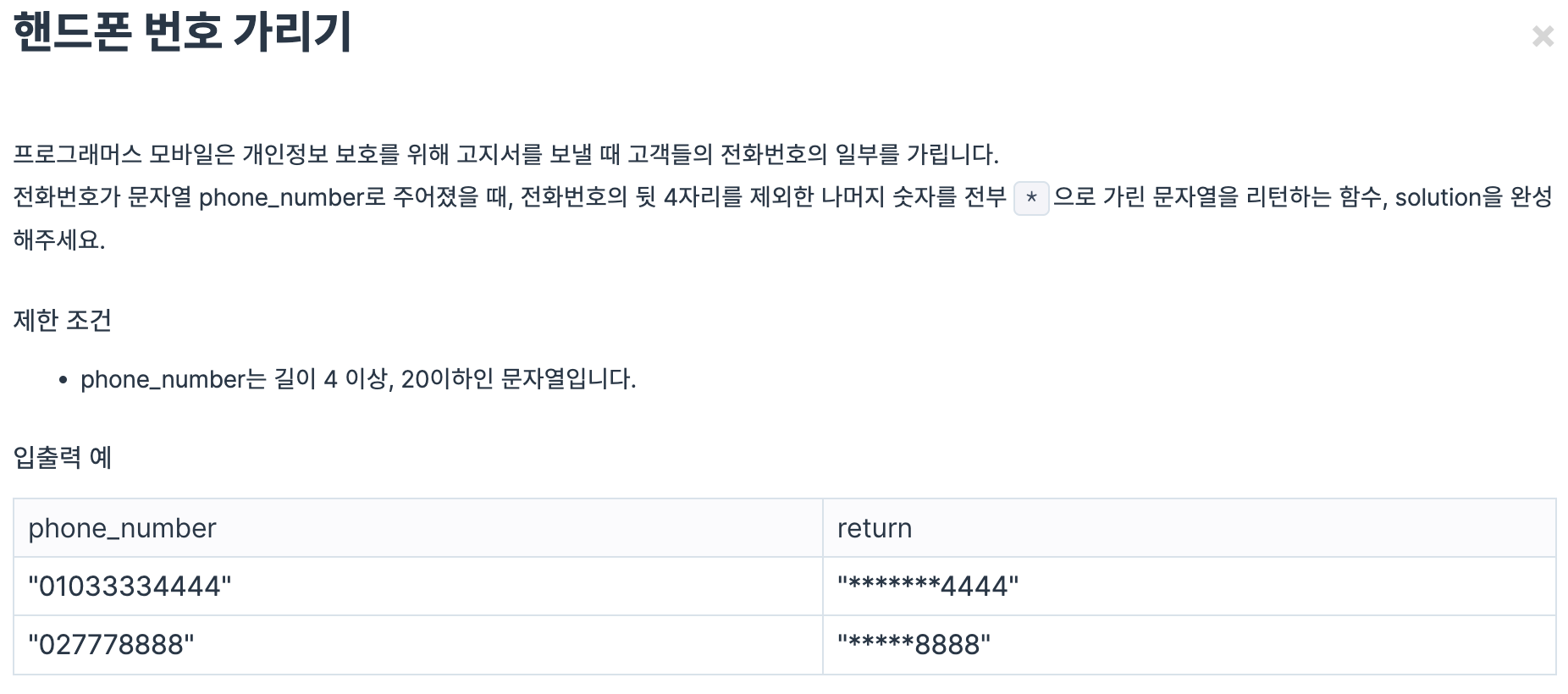 따라서 함수 호출 solution("01033334444")는 결과로 "*******4444"를 반환합니다.