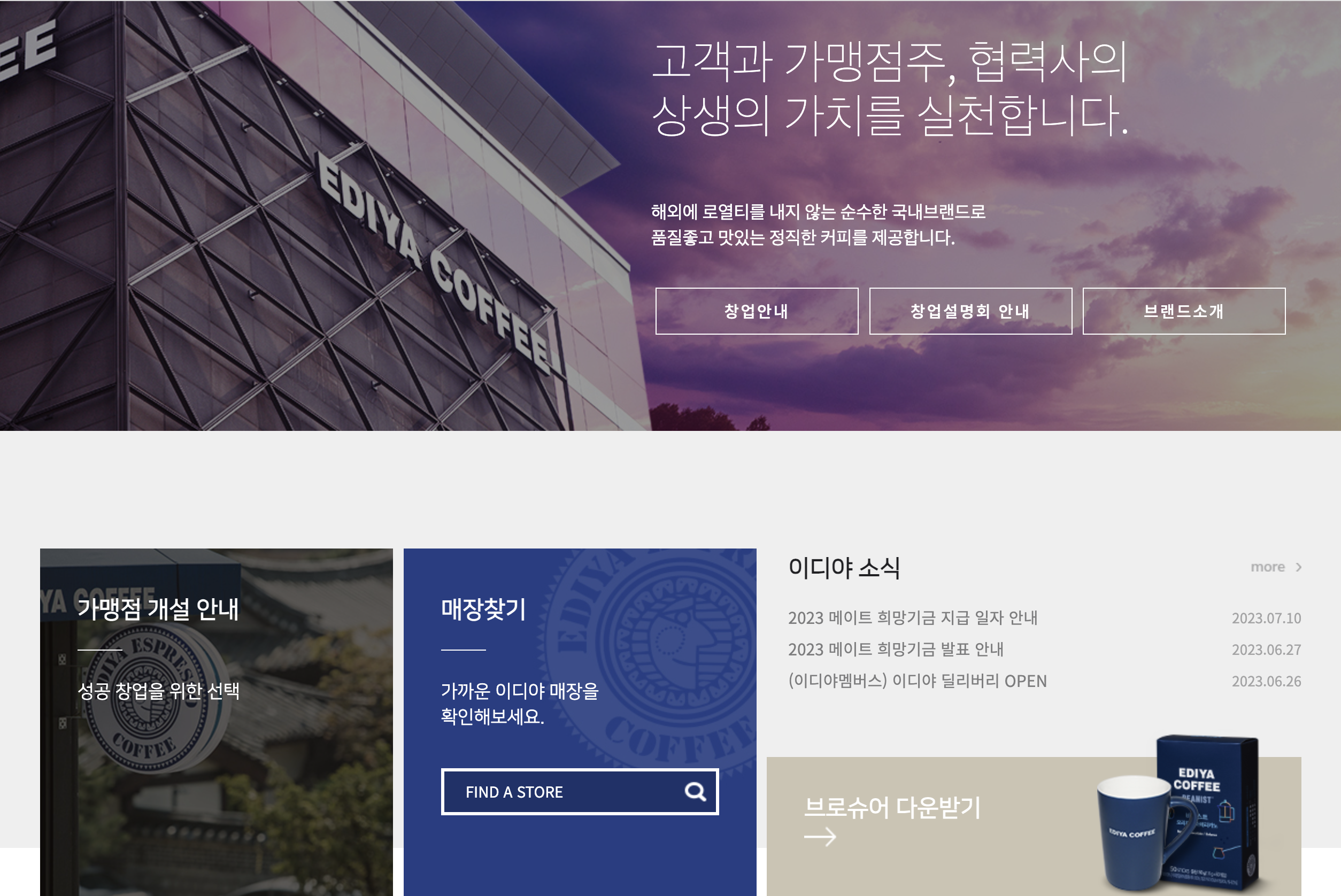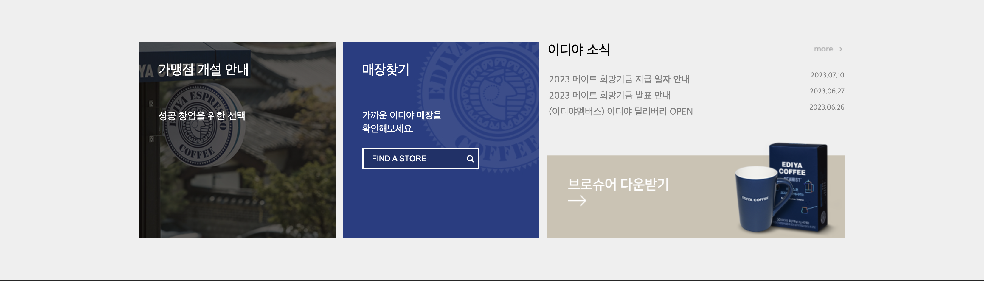 마지막 섹션은 이제까지 짜둔 섹션에 종합같은 느낌이였습니다. 마찬가지로 가맹점 개설 안내, 매장찾기에 background에 이미지를 삽입해주었고 우측부분은 div로 나누어 구성했습니다.