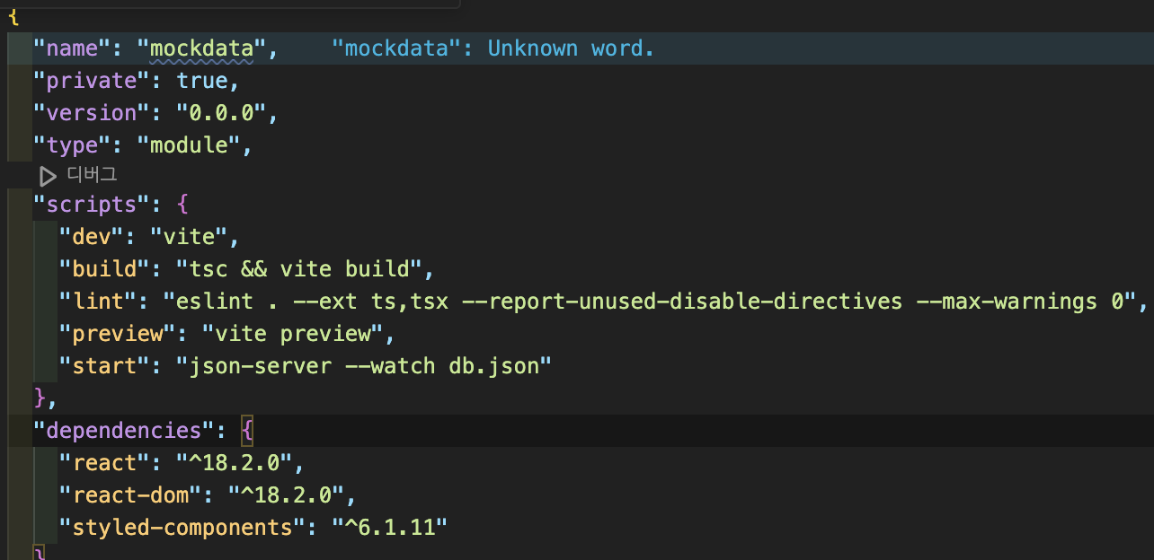 매번 json-server --watch db.json을 입력해주기는 번거로우니 package.json 파일의 script를 수정하여 편하게 실행할 수 있도록